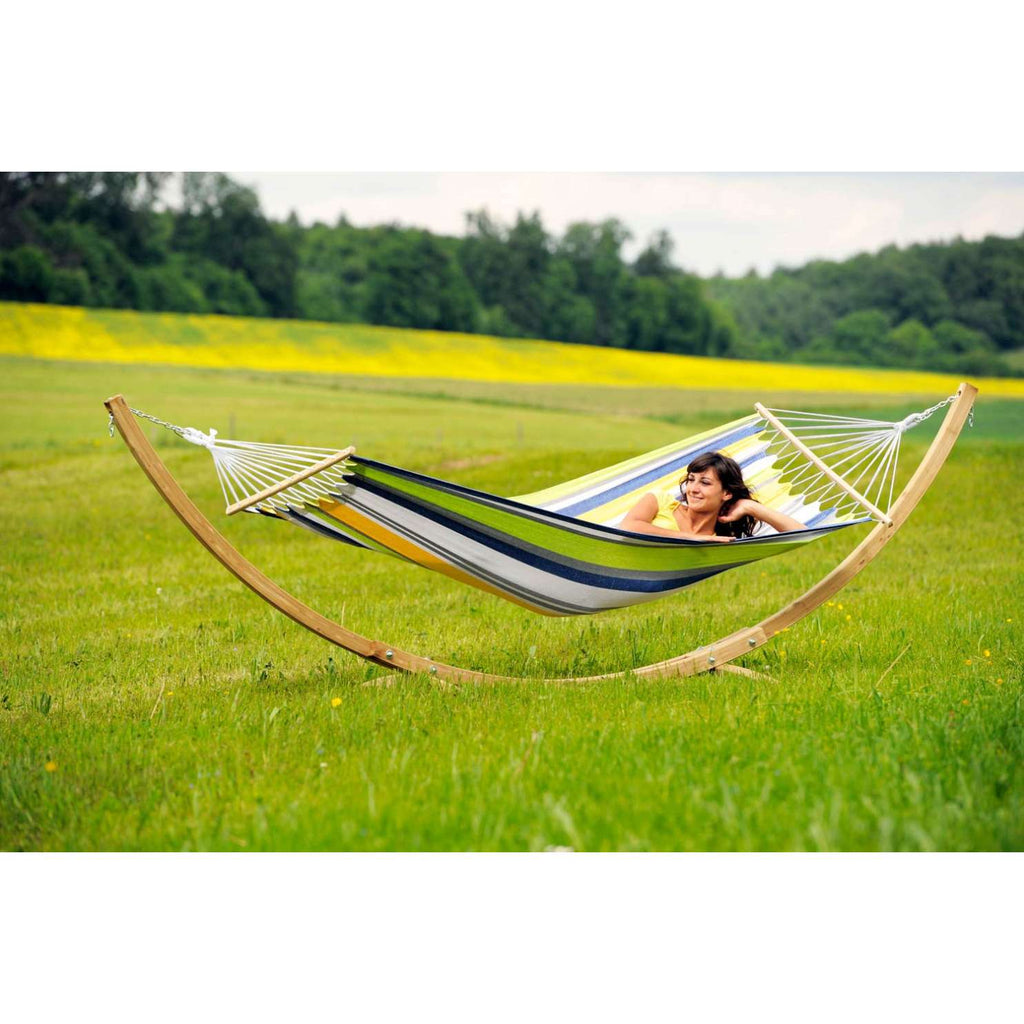 The Kronos + Tonga set is a compact way to relax outdoors—ideal for the garden, patio or balcony, with no trees or wall mounting needed 🌿🪵. The Tonga is a spreader bar hammock, so it stays nicely open for a decorative look and quick, easy lounging ☀️.