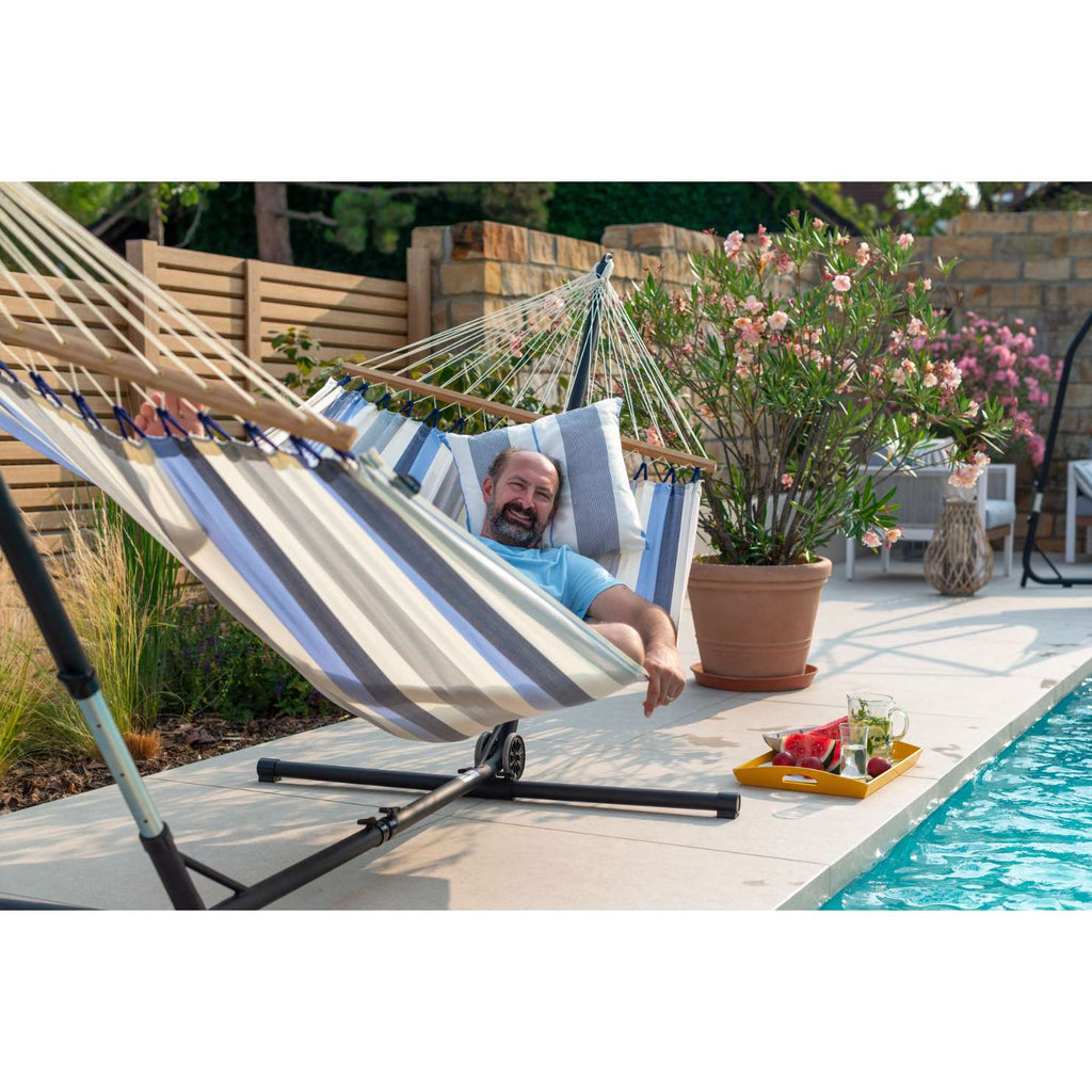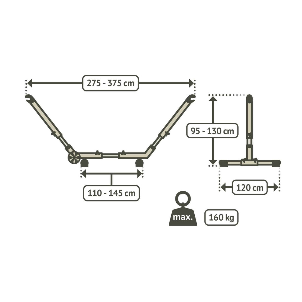 Esterel is a weatherproof, mobile hammock stand made of galvanized steel, designed for flexible outdoor lounging. Thanks to adjustable length and height, it fits hammocks from single to king-size, with or without a spreader bar. Integrated wheels make it easy to move to your favorite sunny or shady spot. 🌤️🧘