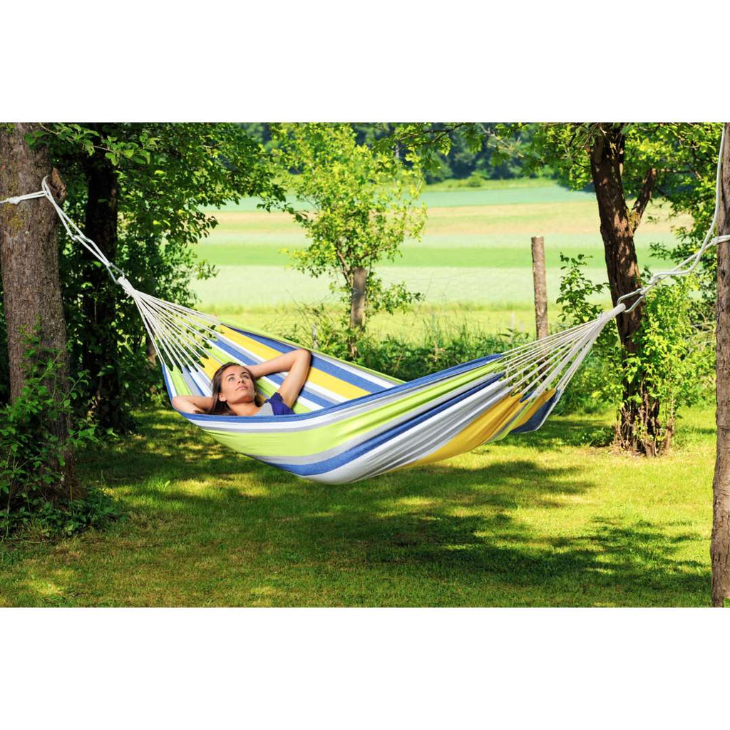 The Amazonas Tahiti hammock is a classic Brazilian style hammock in size M—perfect for relaxing in your garden, on your patio, or balcony. It’s made from EllTex material, designed to be weatherproof and UV-resistant, while still feeling soft like cotton. If you’re looking for a lightweight single person hammock that’s easy to store and carry, Tahiti is a great option—especially since it comes with a colour-matched storage bag.