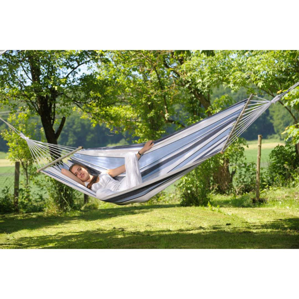 The Amazonas Samba spreader bar hammock is a classic Brazilian style hammock with a wooden bar, designed to stay beautifully open—perfect for your garden, patio, or balcony. It’s made from EllTex material, built to be weatherproof and UV-resistant, while still feeling soft like cotton. Thanks to the large number of suspension cords, weight is distributed evenly for a smooth, comfortable, “weightless” lay.