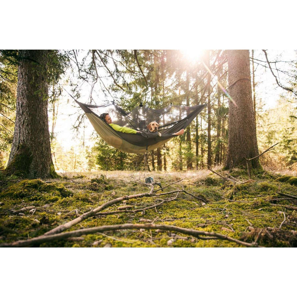 Extra velika ultralahka viseča mreža z integrirano mrežo proti komarjem in diagonalnim toplotnim žepom za podlogo. Model XXL je posebej priporočljiv za visoke osebe nad 1,90 m, saj nudi več prostora za udobno ležanje in spanje na terenu.