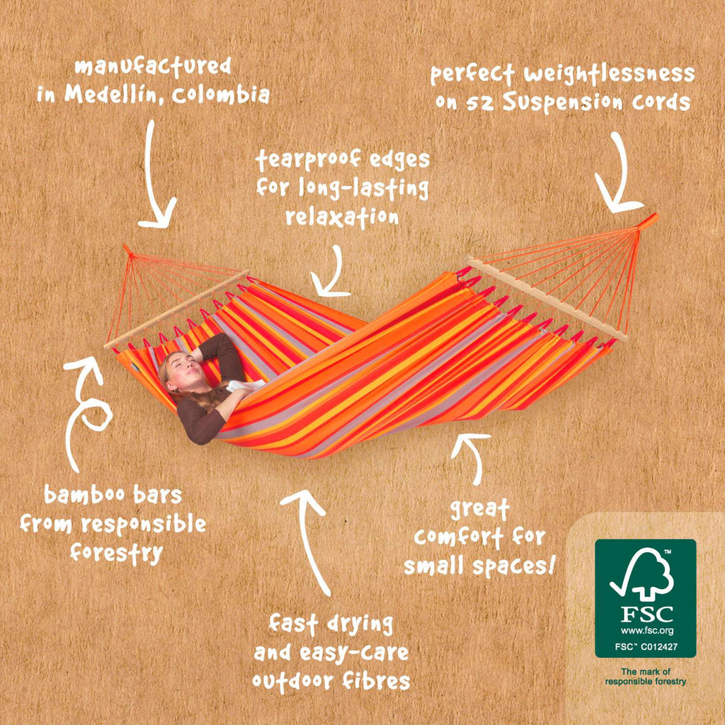 Zaradi 52 napenjalnih vrvic se teža porazdeli bolj enakomerno, ležanje je bolj udobno, mreža pa ima daljšo življenjsko dobo. Prečka je iz FSC™ certificiranega bambusa 🎋, robovi pa so ojačani za boljšo odpornost proti trganju.