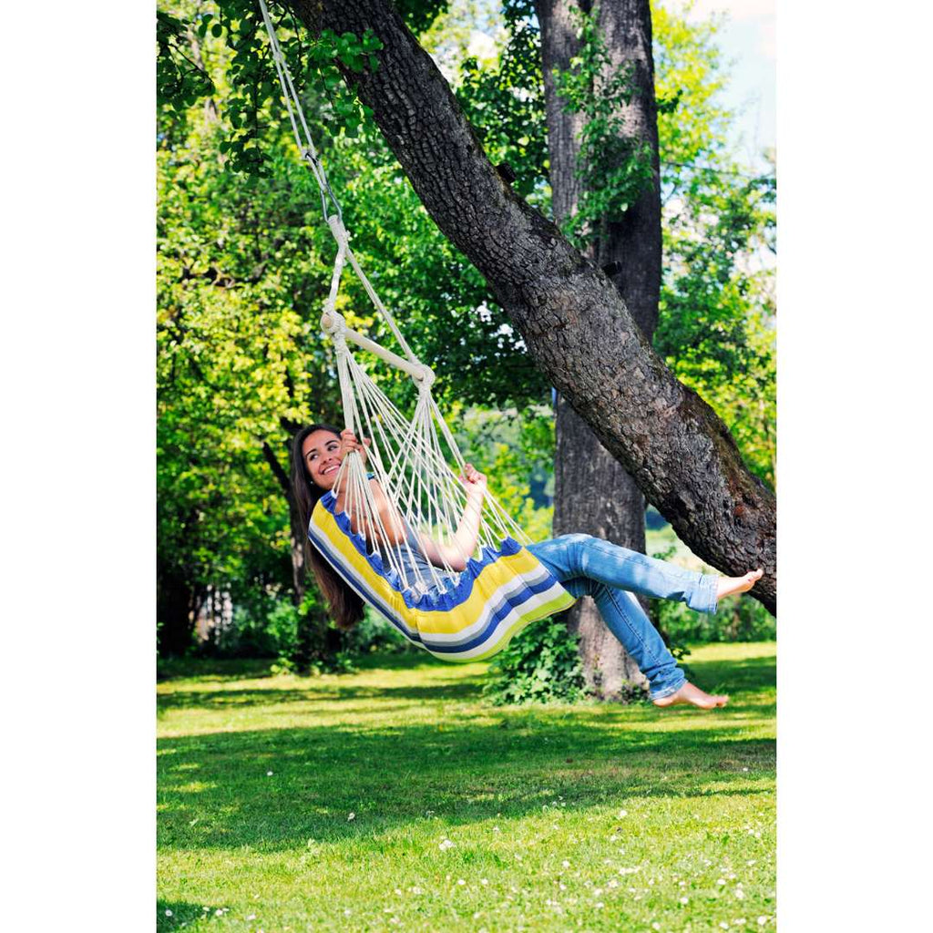 Amazonas Belize je udoben oblazinjen viseči stol, zasnovan za sproščeno sedenje ene osebe. Ima bolj pokončen naslon, zato je odlična izbira, če želite viseči stol za sedenje (ne za ležanje). Mehko oblazinjenje poskrbi za dodatno udobje, stol pa lahko namestite na vrt, teraso, balkon ali v notranje prostore. Če iščete viseči stol za teraso ali viseči stol za stanovanje, ki je udoben in stabilen, je Belize super izbira.