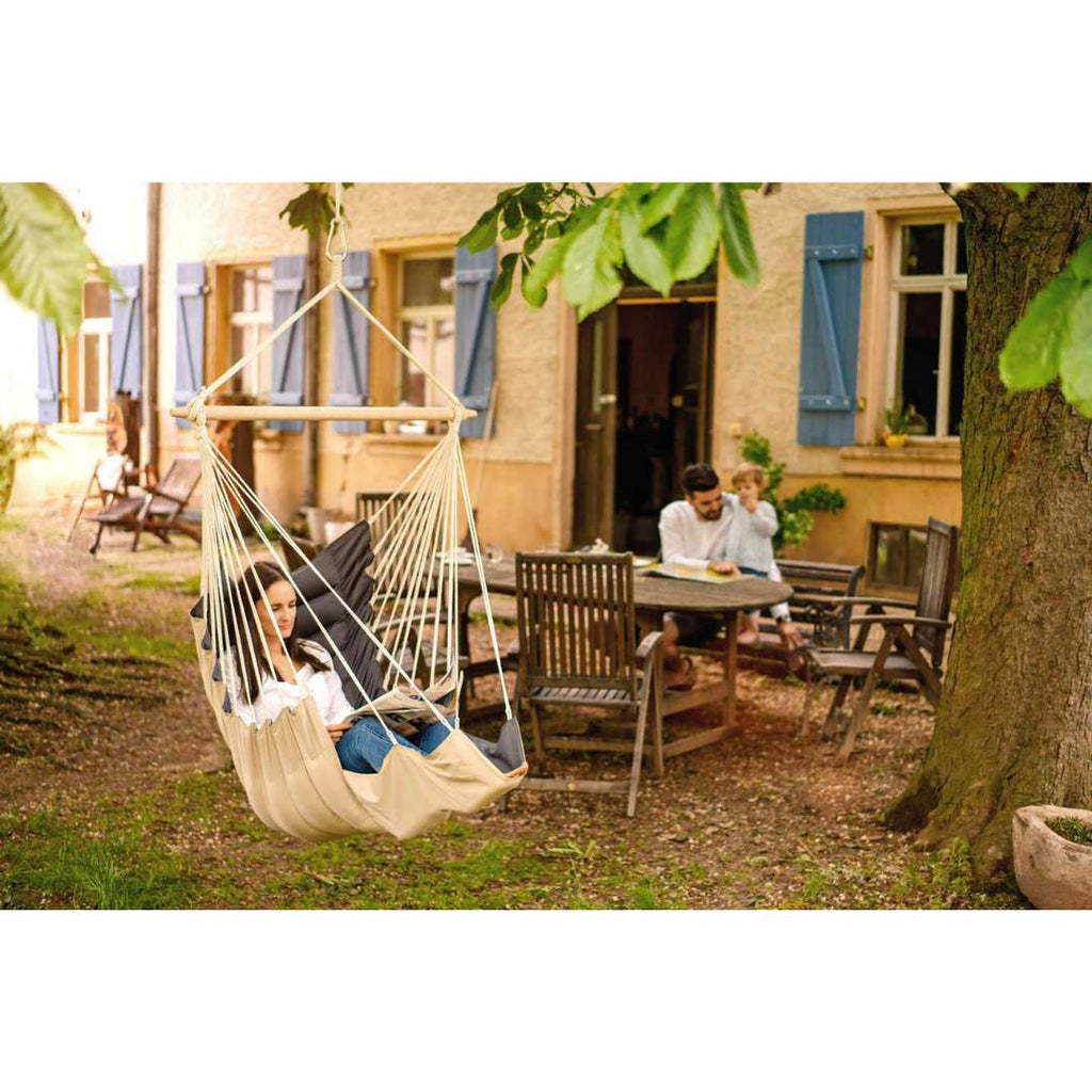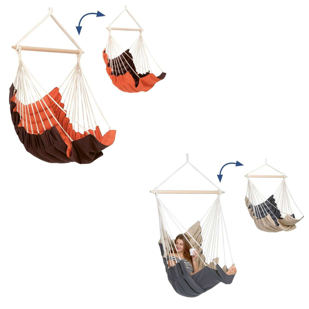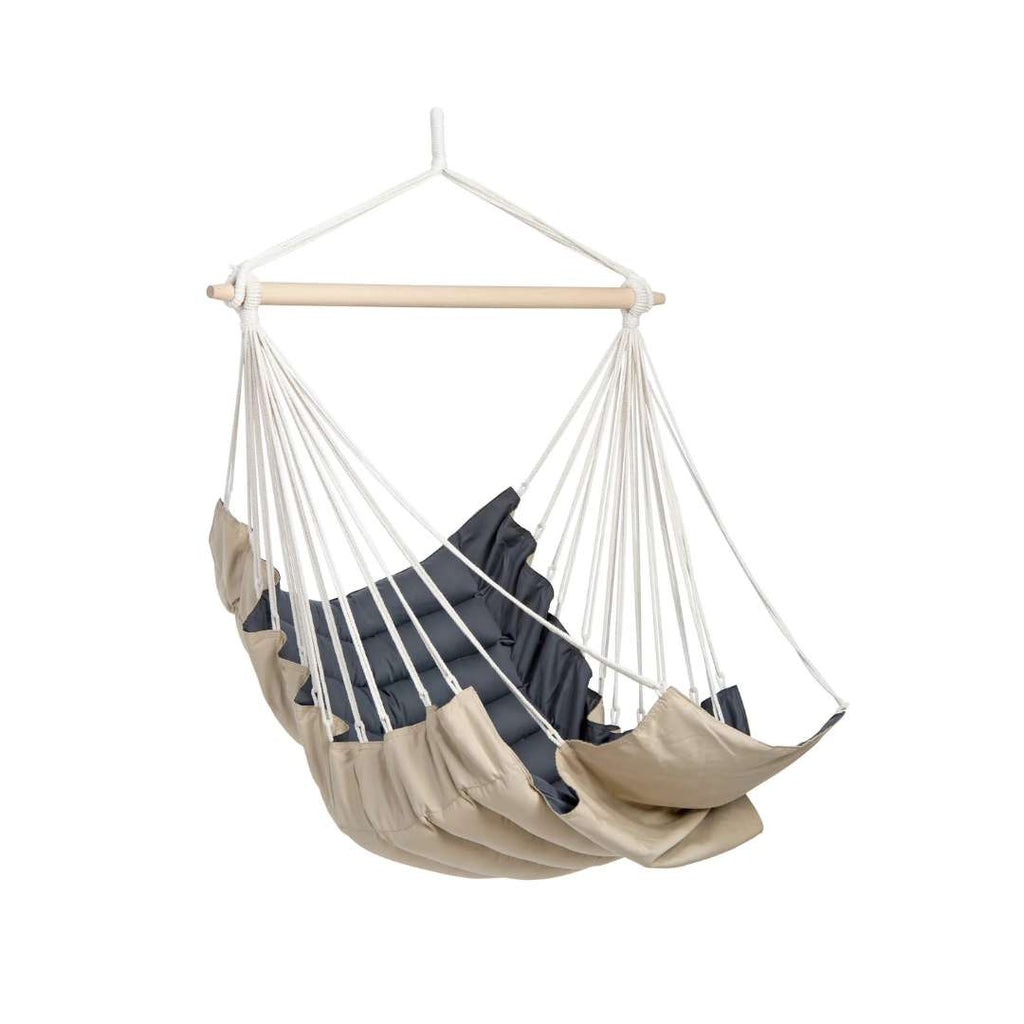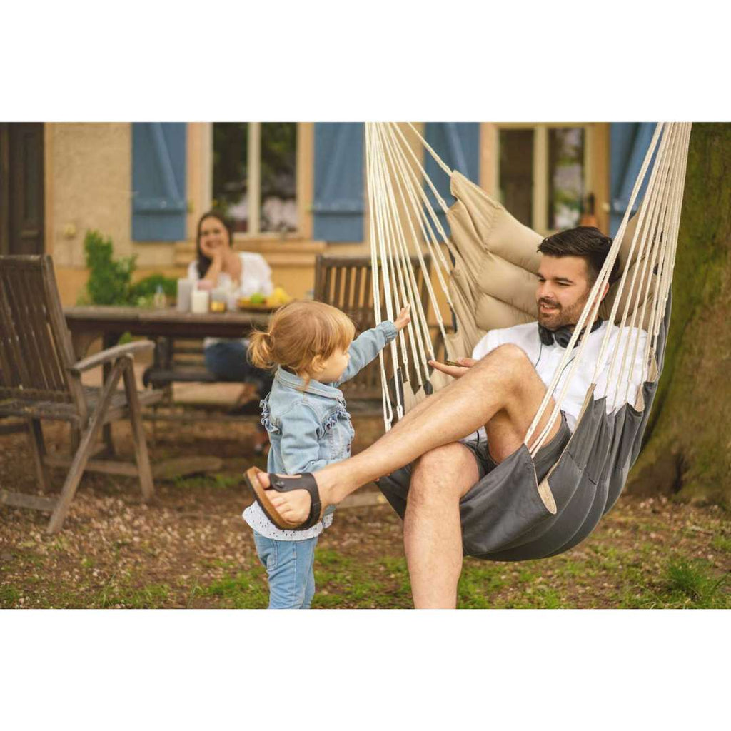 Amazonas California je ekstra velik viseči stol z mehkim oblazinjenjem in naslonom za noge, zato je odlična izbira, če iščete viseči stol za ležanje ali res udoben viseči stol za sproščanje. Zasnovan je tako, da se lahko v njem udobno namesti tudi večji uporabnik – do 150 kg. Posebnost je, da je obojestranski, zato ga lahko uporabljate na obeh straneh in podaljšate življenjsko dobo tkanine.
